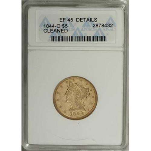 <B>1844-O $5 --Cleaned--ANACS. XF45 Details.</B></I> NGC Census: (91/374). PCGS Population (51/131). Mintage: 364,600. Numismedia Wsl. Price for NGC/PCGS coin in XF45: $409. (#8222)<BR><BR><B>Coin Engraver:</B> Christian Gobrecht<BR><BR><b>Shipping:</b> Coins & Currency (<a target="_blank" href="http://www.heritageauctions.com/common/shipping.php">view shipping information</a>)