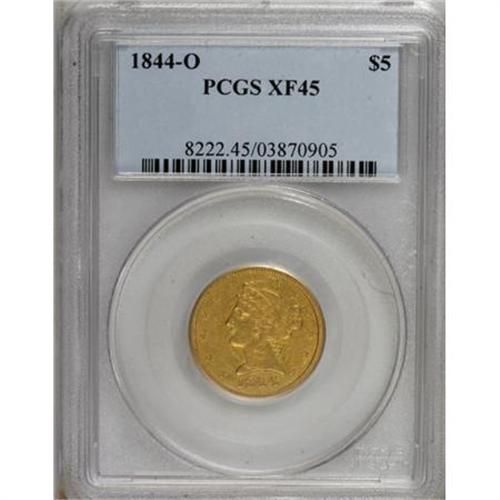 <B>1844-O $5 XF45 PCGS.</B></I> PCGS Population (49/127). NGC Census: (91/349). Mintage: 364,600. Numismedia Wsl. Price for NGC/PCGS coin in XF45: $409. (#8222)<BR><BR><B>Coin Engraver:</B> Christian Gobrecht<BR><BR><b>Shipping:</b> Coins & Currency (<a target="_blank" href="http://www.heritageauctions.com/common/shipping.php">view shipping information</a>)