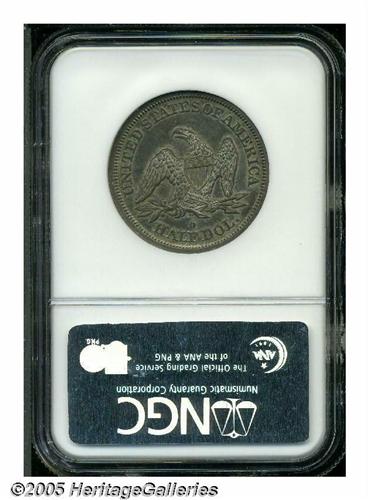 <B>1844-O<50C> Doubled Date AU55 NGC.</B></I> FS-001, WB-103. This variety is technically a repunched date, being created when all four digits were originally entered much too high and into the base of Liberty's rock. The blundered date was only partially effaced before another date was correctly entered in the die. This uncommonly high grade representative displays just a trace of wear beneath steel-violet and pumpkin-orange toning. A few small patches of bright silver color are noticed on and to the left of Liberty's arm. Population: 2 in 55, 2 finer (3/05).