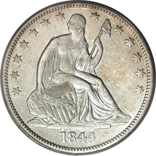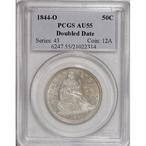 <B>1844-O 50C Doubled Date AU55 PCGS.</B></I> WB-103, Breen-4775. The date was originally punched much too high in the die, with a third of the logotype lost due to the device. The blundered date was only partially effaced before another date was correctly entered in the die. This spectacular variety is featured on the cover of the Wiley/Bugert reference. This untoned example has a good strike and ample bright luster in protected regions. The fields are devoid of individually mentionable abrasions. Population: 3 in 55, 3 finer (11/07).<BR><BR><B>Coin Engraver:</B> Christian Gobrecht<BR><BR><b>Shipping:</b> Coins & Currency (<a target="_blank" href="http://www.heritageauctions.com/common/shipping.php">view shipping information</a>)
