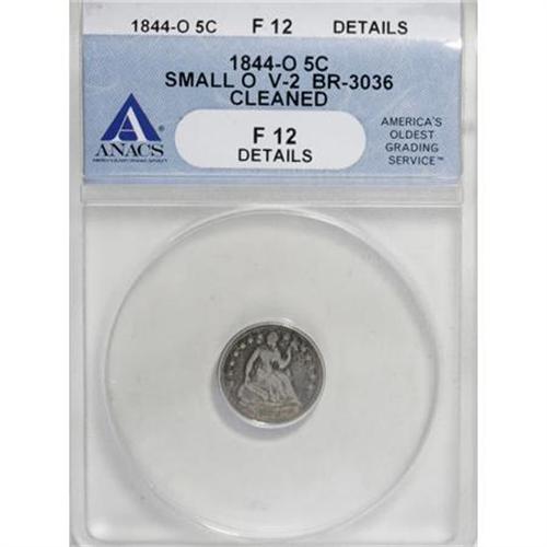 <B>1844-O H10C Small O--Cleaned--ANACS F12 Details.</B></I> V-2. Breen-3036. NGC Census: (0/22). PCGS Population (0/39). Mintage: 220,000. Numismedia Wsl. Price for NGC/PCGS coin in F12: $170. (#4334)<BR><I>From The Al Blythe Collection of Half Dimes.</B></I><BR><BR><B>Coin Engraver:</B> Christian Gobrecht<BR><BR><b>Shipping:</b> Coins & Currency (<a target="_blank" href="http://www.heritageauctions.com/common/shipping.php">view shipping information</a>)