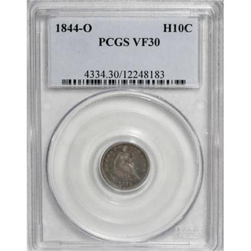 <B>1844-O H10C VF30 PCGS.</B></I> Small O. V-2. The Small O variety is appreciably scarcer than its Medium O counterpart. The reverse is not rotated 180 degrees, that being a diagnostic feature of the Small O die marriage, but it does have a small O mintmark. Both sides of this coin are evenly toned in lavender-gray patina with lighter silver-gray accents on the highpoints. Nicely detailed for the grade with some minor blemishes on each side. An important key date in the series. <BR><I>From The Al Blythe Collection of Half Dimes.</B></I><BR><BR><B>Coin Engraver:</B> Christian Gobrecht<BR><BR><b>Shipping:</b> Coins & Currency (<a target="_blank" href="http://www.heritageauctions.com/common/shipping.php">view shipping information</a>)