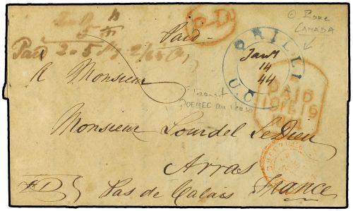 1844 Pre-stamp envelope to FRANCE cancelled by ORILLIA U.C. double ring in blue with date in manuscript routed via Quebec with manuscript "Paid", handstruck P.D. in oval sent via London with TOMBSTONE PAID with French entry cachet and arrival. A rare trans-Atlantic item.