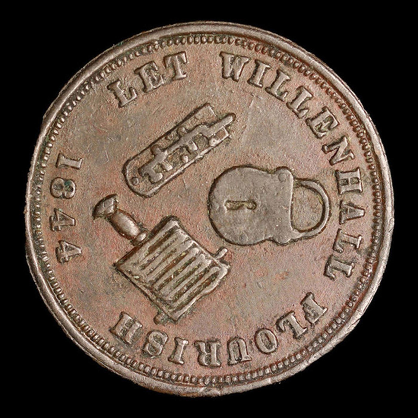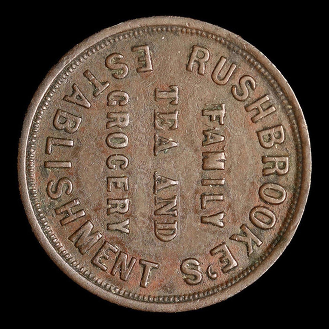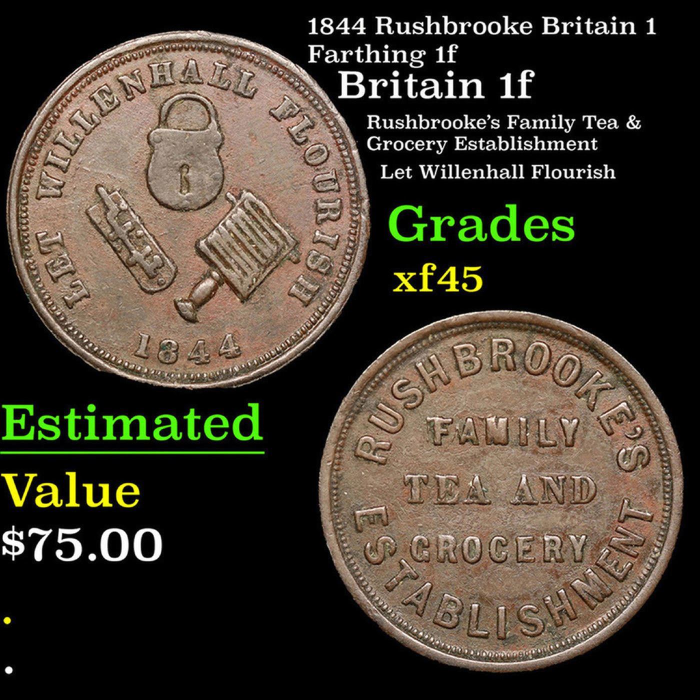 1844 Rushbrooke Britain 1 Farthing 1f Grades xf+. In 1844 in Willenhall the miller John Austin issued tokens worth one farthing (a quarter of an old penny; there were 960 farthings in a pound so each was worth about one tenth of a present day penny.) These farthings were used to give change in the shop or to pay employees so that they could spend the money in the Austin shop or, apparently, elsewhere. There was a shortage of coinage at the time and the issue of tokens was fairly commonplace. One side had "Austin's Family Tea and Grocery Establishment" and the other had the resounding slogan "Let Willenhall Flourish" with a lock, a bolt and a currycomb - Willenhall's main products. When Joshua Rushbrooke took over the Austin establishment a new coin was minted, using the same design for the "Let Willenhall Flourish" side. In 1862 these tokens were declared illegal and new bronze coinage was issued. The Rushbrooke Farthings were redeemed by Rushbrooke's at considerable cost and sold for their scrap value.