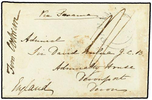 1844 SOBRE circulado a DEVON (Gran Bretaña) dirigido al Almirante Sir David... G.C.B con indicación manuscrita "From Cochran" (Almirante Lord Cochran). En el frente fechador de doble círculo de PANAMA grande y al dorso KINGSTON/JAMAICA.