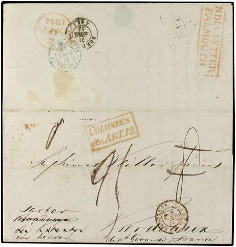 1844 Stampless envelope written from PORT LOUIS sent on the steamer "Tartar" with boxed accountancy COLONIES & c ART 12, routed via London with boxed INDIA LETTER FALMOUTH in red (Robertson In1), charged "8" erased and taxed "21" in manuscript with BORDEAUX receiver. Very fine.