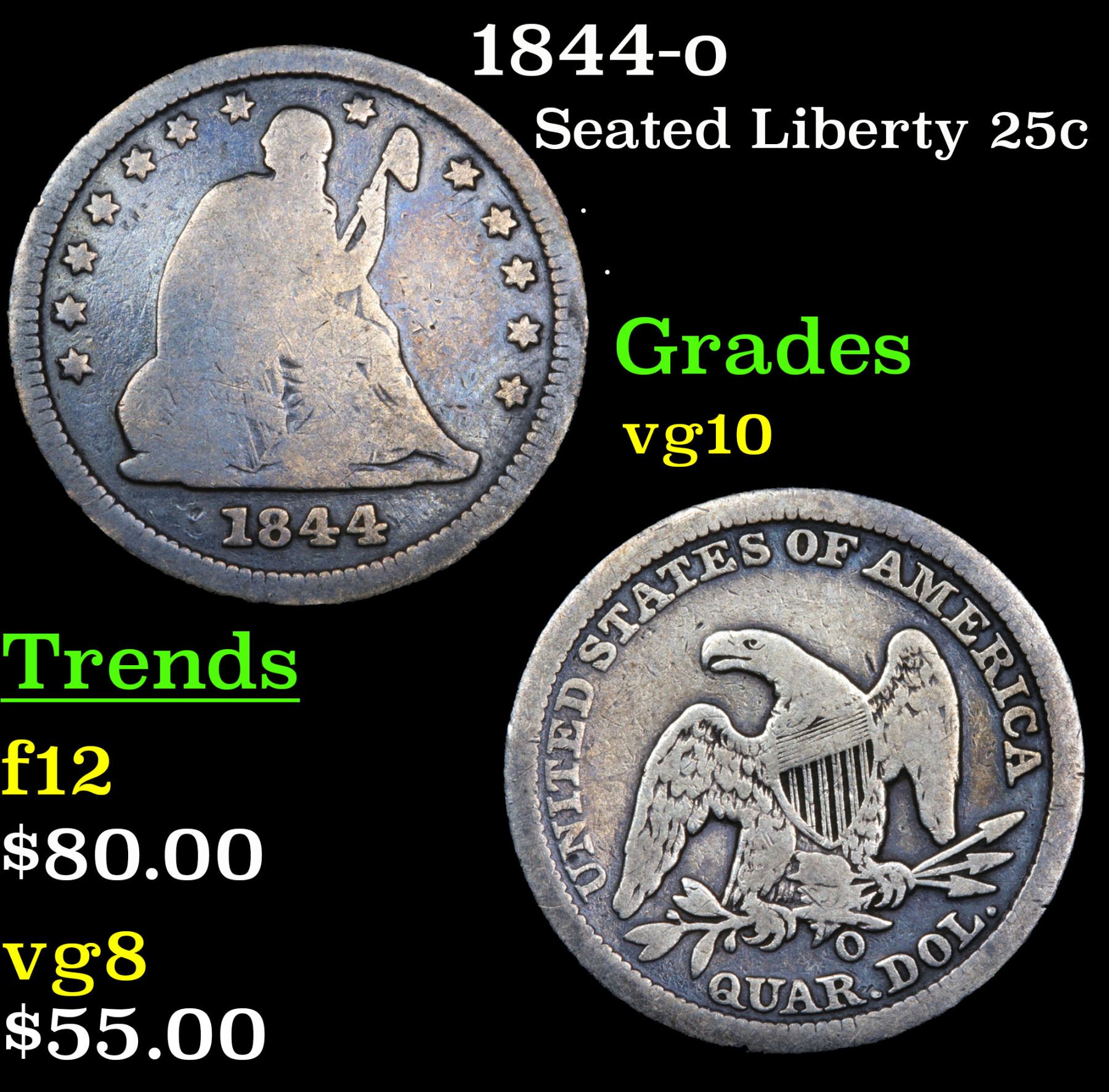1844-o Seated Liberty Quarter 25c Grades vg+.