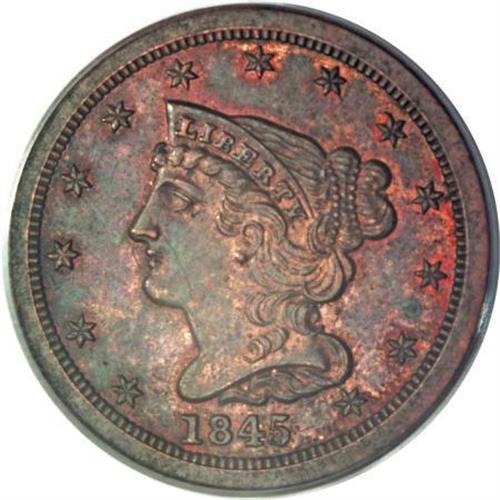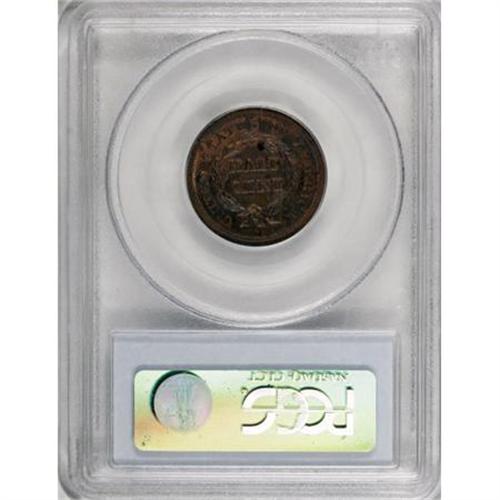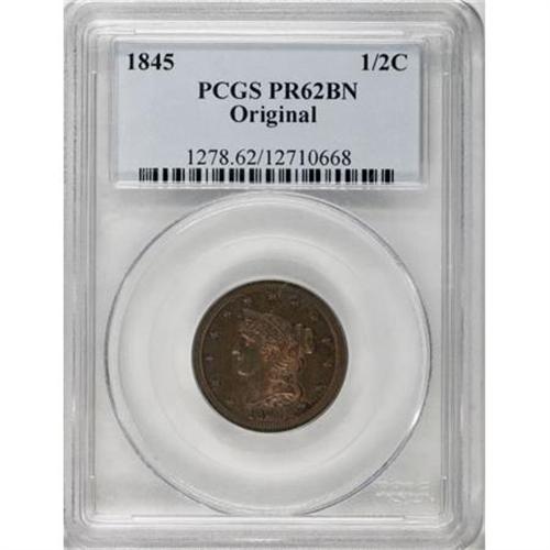 <B>1845 1/2 C Original PR62 Brown PCGS.</B></I> Breen-1a, High R.6. This needle-sharp proof has blushes of orange-red on each side, although the open fields and the cheek are medium brown. The preservation is pleasing despite a thin mark left of the cheek. PCGS and NGC combined have certified only nine Originals in all grades (3/08). EAC PR60.<BR><BR><B>Coin Engraver:</B> Christian Gobrecht<BR><BR><b>Shipping:</b> Coins & Currency (<a target="_blank" href="http://www.heritageauctions.com/common/shipping.php">view shipping information</a>)