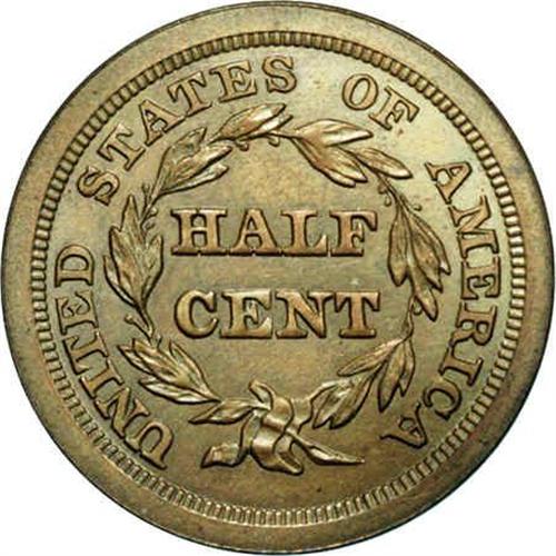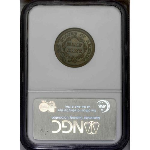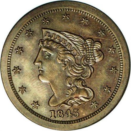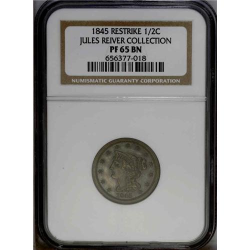 <B>1845<1/2 C> Second Restrike. SR-22, B-3, R.6. PR65 Brown NGC. PR60 EAC.</B></I> Small date; Small berries, file marks at RICA. Early state of the reverse die with file marks clear, and diagonal striae fully visible. <B>This is the plate coin in the second edition of Cohen.</B></I> Number 14 of 19 examples listed by Richard Coleman in his <I>Monograph of Second Restrike Proof Half Cents.</B></I> The date has the digit 5 leaning to the right and distinctly recut. The obverse has intermingled olive and chocolate-brown tones while the reverse is fully a rich olive color. Pale blue accents add to the overall eye appeal on both sides. The fields are mildly reflective and not deeply mirrored as expected on these Proofs. Some design weakness is noted, especially on Liberty's hair strands over the ear, and on some of the leaves in the wreath. A thin line of bright copper color extends from the top of Liberty's head to the border just below star 9, the result of a mild abrasion in that area. Without this abrasion, the EAC grade would approach the NGC grade. This example appears to qualify as Series V in Breen's notation.<BR><I>Ex: Stack's (4/1962), lot 235; 1976 ANA (Stack's), lot 195; Superior (10/1977), lot 151; Julian Leidman (7/18/1978).</B></I> Envelope Included.