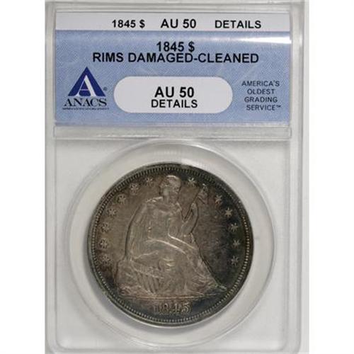 <B>1845 $1 --Cleaned, Rim Damaged--ANACS. AU50 Details.</B></I> NGC Census: (5/79). PCGS Population (30/53). Mintage: 24,500. Numismedia Wsl. Price for NGC/PCGS coin in AU50: $900. (#6931)<BR><BR><B>Coin Engraver:</B> Christian Gobrecht<BR><BR><b>Shipping:</b> Coins & Currency (<a target="_blank" href="http://www.heritageauctions.com/common/shipping.php">view shipping information</a>)