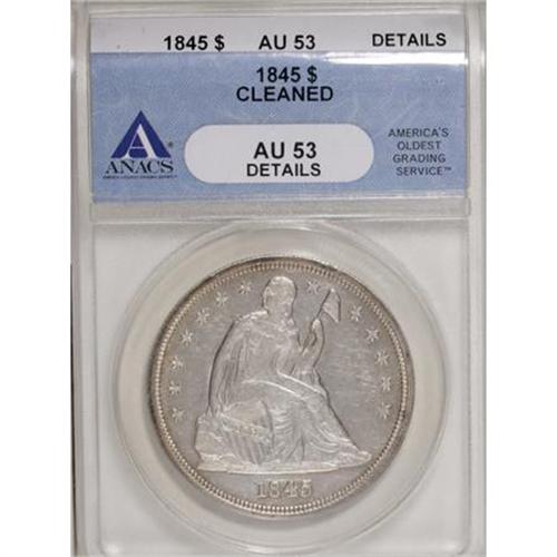<B>1845 $1 --Cleaned--ANACS. AU53 Details.</B></I> NGC Census: (15/64). PCGS Population (16/37). Mintage: 24,500. Numismedia Wsl. Price for NGC/PCGS coin in AU53: $1,150. (#6931)<BR><BR><B>Coin Engraver:</B> Christian Gobrecht<BR><BR><b>Shipping:</b> Coins & Currency (<a target="_blank" href="http://www.heritageauctions.com/common/shipping.php">view shipping information</a>)