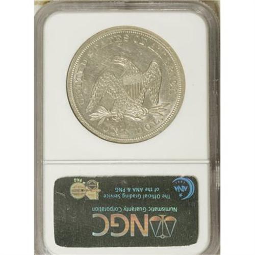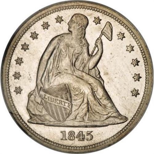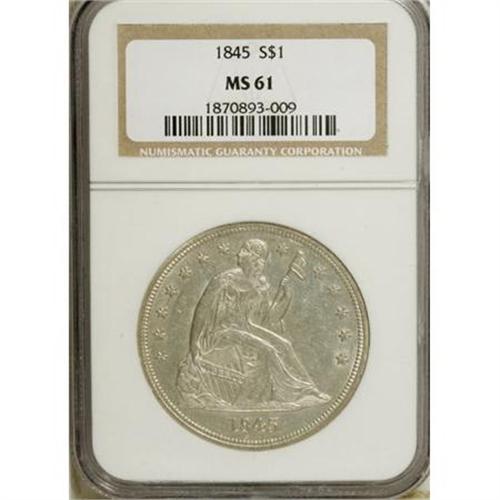 <B>1845 $1 MS61 NGC.</B></I> A mere 24,500 business shrike dollars were struck in 1845, and Mint State survivors are in short supply. This bright and essentially untoned MS61 example exhibits a well impressed strike, and has the most potent luster in the areas around and the interstices of the design features. A few minute contact marks are scattered over each side. Census: 7 in 61, 8 finer (2/08).<BR><I>From The Queller Family Collection of Silver Dollars.</B></I><BR><BR><B>Coin Engraver:</B> Christian Gobrecht<BR><BR><b>Shipping:</b> Coins & Currency (<a target="_blank" href="http://www.heritageauctions.com/common/shipping.php">view shipping information</a>)