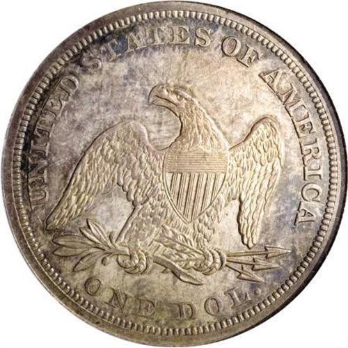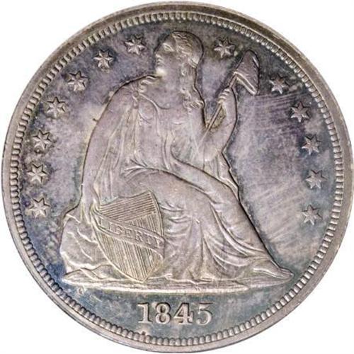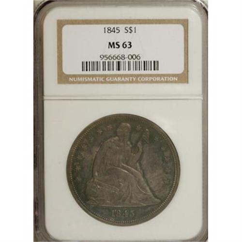 <B>1845 $1 MS63 NGC.</B></I> It has been many years since we last offered an 1845 Seated dollar at the Select Mint State grade level. That seems easy to understand when one considers that only three pieces have received the MS63 designation, from NGC, and that just one coin has been graded finer by the same company, at MS64 (7/07). This example is deeply toned over both sides, in a mixture of mauve-gray, purple, and forest-green colors. The design elements are generally well struck, and surface marks are minimal for the grade. A conditionally rare No Motto survivor from a mintage of just 24,500 coins. <BR><BR><B>Coin Engraver:</B> Christian Gobrecht<BR><BR><b>Shipping:</b> Coins & Currency (<a target="_blank" href="http://www.heritageauctions.com/common/shipping.php">view shipping information</a>\)