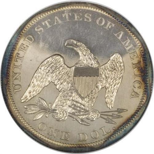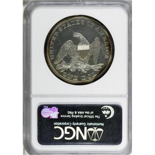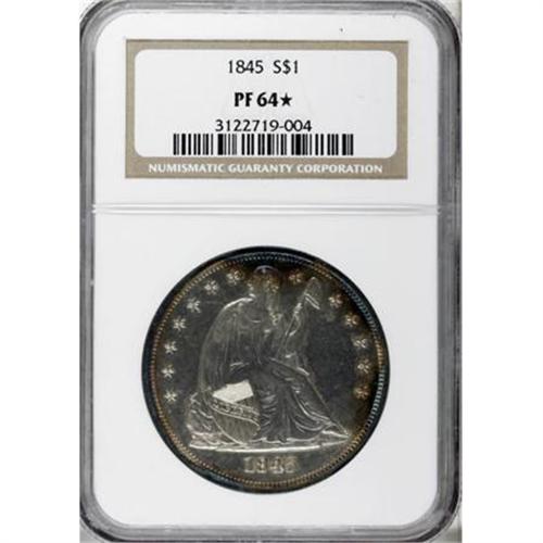<B>1845 $1 PR64 <img src="/images/star.gif" width="10" height="10" alt="" border="0"> NGC.</B></I> Splashes of ocean-blue and orange-gold throughout the peripheries undoubtedly inspired the Star designation, awarded by NGC for superior eye appeal. The intricate strike will also please the collector. Both major devices exhibit contrast with the reflective fields, although NGC has omitted a cameo designation. All proof 1845 dollars were struck from the "common reverse" used to coin most 1840 to 1850 proofs. Per Bowers (1993), two proof obverse dies are known, and the present piece is his second variety. It is identified by prominent recutting on the 84 in the date. Census: 7 in 64, 6 finer (2/08).<BR><I>Ex: Amon G. Carter, Jr. Collection (Stack's, 1/1984), lot 251.</B></I><BR><I>From The Queller Family Collection of Silver Dollars.</B></I><BR><BR><B>Coin Engraver:</B> Christian Gobrecht<BR><BR><b>Shipping:</b> Coins & Currency (<a target="_blank" href="http://www.heritageauctions.com/common/shipping.php">view shipping information</a>)