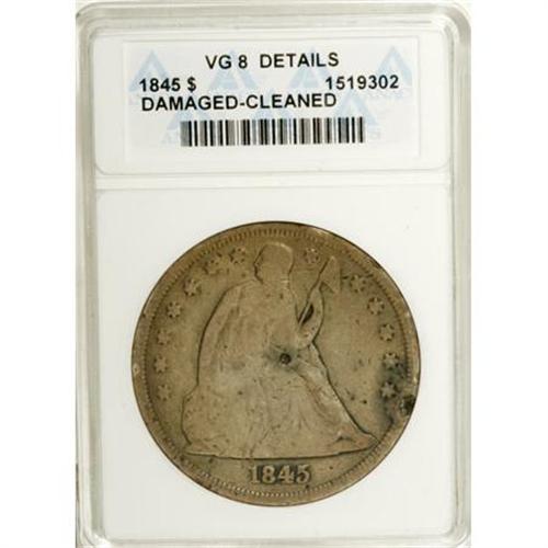 <B>1845 $1 --Cleaned, Damaged--ANACS. VG8 Details.</B></I> NGC Census: (0/131). PCGS Population (0/151). Mintage: 24,500. Numismedia Wsl. Price: $242. (#6931)<BR><BR><B>Coin Engraver:</B> Christian Gobrecht<BR><BR><b>Shipping:</b> Coins & Currency (<a target="_blank" href="http://www.heritageauctions.com/common/shipping.php">view shipping information</a>\)