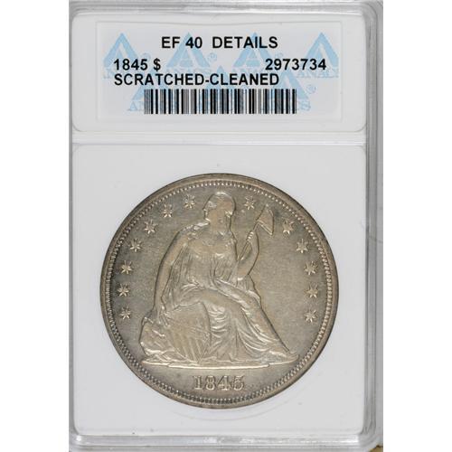 <B>1845 $1 --Cleaned, Scratched--ANACS. XF40 Details. </B></I> NGC Census: (16/208). PCGS Population (20/108). Mintage: 24,500. Numismedia Wsl. Price for NGC/PCGS coin in XF40: $500. (#6931)<BR><BR><b>Shipping:</b> Coins & Currency (<a target="_blank" href="http://www.heritageauctions.com/common/shipping.php">view shipping information</a>)