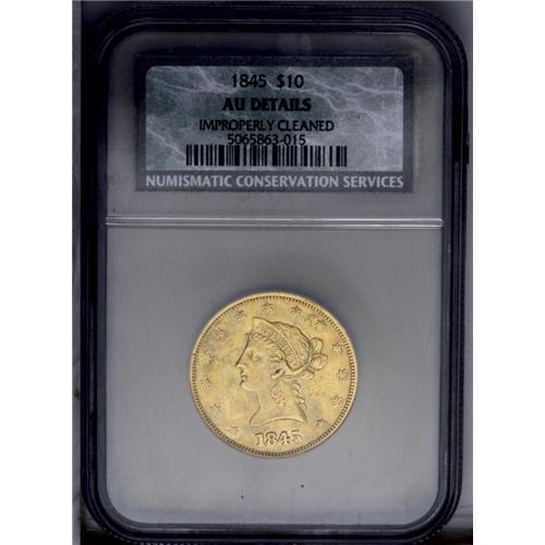 <B>1845<$10>--Improperly Cleaned--NCS. AU Details.</B></I> A hairlined but richly detailed example of this underappreciated Philadelphia Mint issue. NGC has certified fewer than 100 pieces in all grades.<BR><I>From The Steve Glenn Collection.</B></I> <BR><BR><B>Important notice:</B> Heritage usually auctions material at the rate of 200-250 lots per hour. On some occasions eBay Live bid software or the Internet may not be able to keep up with the pace of the auction. We recommend placing a realistic absentee bid now as insurance to avoid disappointment. Occasionally the auctioneer may eliminate or reject an eBay Live bid, and the auctioneer may also reopen a lot after the close of the eBay live bidding (usually because we missed an audience bid), and may reject your bid even if it shows you as the winning bidder. By bidding via eBay Live, you agree that Heritage may award the lot to another bidder at its sole discretion under the circumstances described above or any other reasonable circumstances. Since eBay bids are not shown to us until we open the lot on the floor, we treat those bids just like floor bids. In most cases the floor responds before the eBay bid is presented to us, due to Internet lag time, so for consistency we have made it a policy that floor bids are always considered first over tie eBay live bids. Also please note that all Heritage lots purchased through eBay Live carry a 20% Buyer's Premium. Please make sure you read the Terms and Conditions before you bid. This lot is being auctioned in conjunction with a live floor auction by Heritage Galleries & Auctioneers. All final auction and invoice information will be supplied by Heritage Galleries & Auctioneers, and all other information should be considered preliminary. Lot:3920 <BR><BR><B>Winning Notification and Billing:</B> After the FINAL session in this auction is complete, Heritage will send e-mail and snail mail invoices. This process normally takes several days. All final auction and invoice information will be supplied by Heritage Galleries & Auctioneers, and all other information should be considered preliminary. <BR><BR>This auction will be conducted on a live auction floor and over the Internet through eBay Live. If you choose to place an absentee bid, please take a moment to <font color='#0000ff'><u><a href='http://pages.ebay.com/liveauctions/help/before/laabsentee.html'>learn how eBay Live absentee bidding works</a></u></font><font color='#000000'>