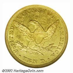 1845 $10 AU55 NGC. The 1845 (26,153 pieces produced) is equally as rare as the lower mintage 1844, the 1839 Small Letters, and the 1846. When offered at all, the '45-P is apt to grade no finer than XF. We have not handled a Choice AU representative since 1997. Rich green-gold color warms to yellow-gold shades as the coin turns into the light. The devices are sharply struck throughout with minimal rub, and remnants of the original mint finish are still evident. Moderately abraded with a pair of obverse planchet voids (as struck) at stars 2 and 12 that should serve well as pedigree markers. Population: 5 in 55, only three are finer, just one of which is Mint State (7/02). Important notice: We expect to be auctioning lots at the rate of 200-250 per hour. Sometimes eBay Premier live bid software cannot keep up with that pace, so we strongly recommend that you place a realistic proxy bid now as insurance to avoid disappointment. Also please note that all Heritage/CAA lots purchased through eBay Premier carry a 20% Buyer's Premium. Please make sure you read the Terms and Conditions.