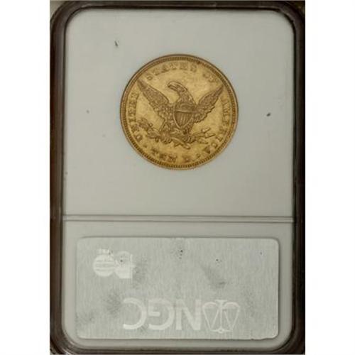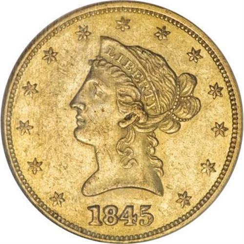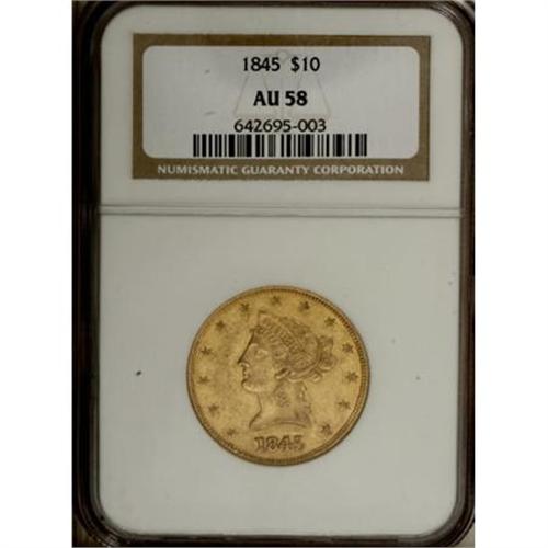 <B>1845 $10 AU58 NGC.</B></I> As is often the case with P-mint gold, the 1845 eagle is a somewhat-overlooked rarity that becomes nearly impossible to locate once the AU threshold is reached. Few examples are graded finer than the present example, which while moderately abraded, benefits from considerable luster accented in pleasing green-gold and reddish patina. Census: 7 in 58, 3 finer (12/07).<BR><BR><B>Coin Engraver:</B> Christian Gobrecht<BR><BR><b>Shipping:</b> Coins & Currency (<a target="_blank" href="http://www.heritageauctions.com/common/shipping.php">view shipping information</a>)