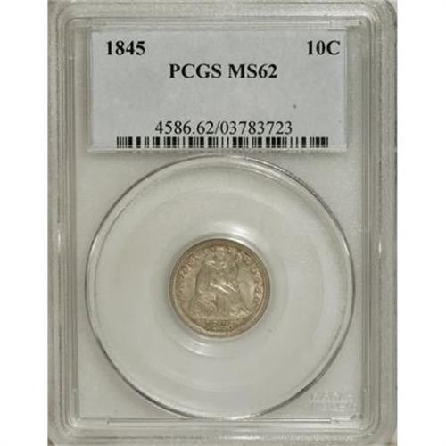 <B>1845 10C MS62 PCGS.</B></I> PCGS Population (12/33). NGC Census: (19/61). Mintage: 1,755,000. Numismedia Wsl. Price for NGC/PCGS coin in MS62: $390. (#4586)<BR><BR><B>Coin Engraver:</B> Christian Gobrecht<BR><BR><b>Shipping:</b> Coins & Currency (<a target="_blank" href="http://www.heritageauctions.com/common/shipping.php">view shipping information</a>)