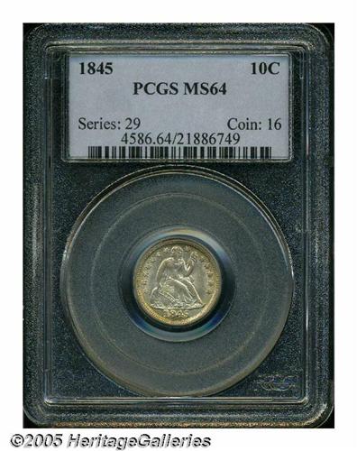 <B>1845<10C> MS64 PCGS.</B></I> Well struck with good luster and pleasingly toned surfaces. Golden-gray color in the centers yields to slightly darker apricot-tan patina near the borders. The obverse fields display some very wispy marks. A lovely and solidly graded near-Gem. Population: 16 in 64, 1 finer (4/05).