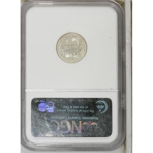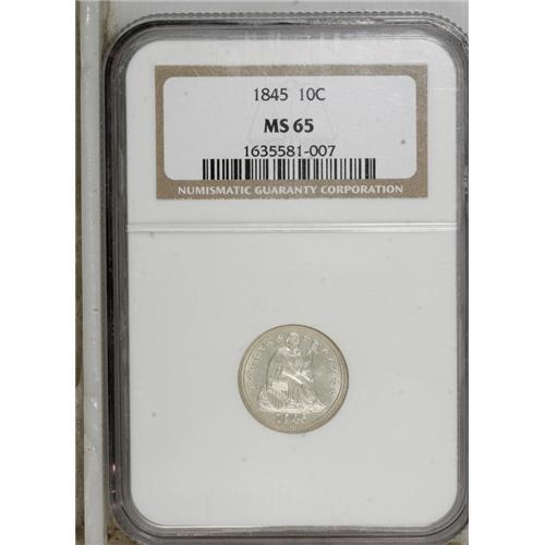 <B>1845 10C MS65 NGC.</B></I> Fortin 103. Repunched Date. The 5 in the date is triple punched, both above and below the flag. While a common variety, the Repunched Date is a popular one with collectors, and it is often offered as such because it is easily recognized. This is a sharply struck coin that is brilliant throughout. The fields show slight evidence of die striations, which impart a brightness to each side that adds even more to the coin's overall attractiveness. There are no mentionable abrasions on either side, though some faint hairlines are noted in the obverse fields. An important opportunity for the type or variety collector. Census: 8 in 65, 7 finer (2/07).<BR><BR><b>Shipping:</b> Coins & Currency (<a target="_blank" href="http://www.heritageauctions.com/common/shipping.php">view shipping information</a>)