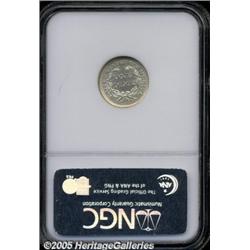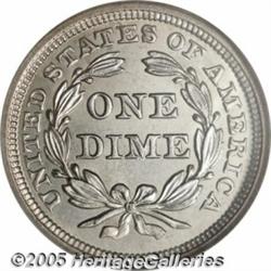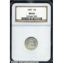 <B>1845 10C MS65 NGC.</B></I> Repunched Date. Variety 101. The 5 in the date is triple punched, both above and below the flag. While a common variety, the Repunched Date is a popular one with collectors and it is often offered as such because of its easy recognizability. This is a sharply struck coin that is brilliant throughout. The fields show slight evidence of die striations, which impart a brightness to each side that adds even more to the coin's overall attractiveness. There are no mentionable abrasions on either side. An important opportunity for the type or variety collector. Population: 7 in 65, 7 finer (2/05).
