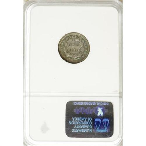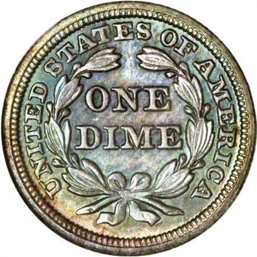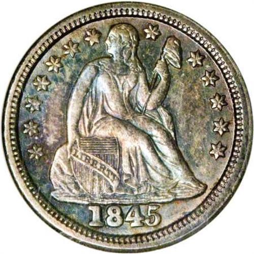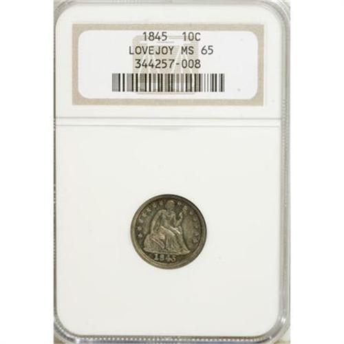 <B>1845 10C MS65 NGC.</B></I> Ex: Lovejoy. All four date digits nearly touch the rock, and a faint diagonal die crack passes through the E in STATES. Deep sea-green and plum-red toning drapes this colorful and virtually mark-free Gem. Well struck aside from the center of star 7.<BR><I>Ex: Allen F. Lovejoy Collection (Stack's, 10/90), lot 232.</B></I><BR><BR><B>Coin Engraver:</B> Christian Gobrecht<BR><BR><b>Shipping:</b> Coins & Currency (<a target="_blank" href="http://www.heritageauctions.com/common/shipping.php">view shipping information</a>)
