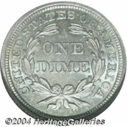 <table><tr><td><table><tr><td>1845 10C MS66 NGC. Like the other "common" Seated dimes of the 1840s, this issue falls off markedly in availability above the near-Gem grade level. This is a flashy specimen with good definition, save for several of the stars on the right side of the obverse, and pristine faces. The thickly frosted devices contrast nicely with the more thinly endowed fields. The obverse shows a medium coating of reddish-golden color, the reverse is an attractive turquoise-blue color. A lovely piece and a rare find this nice. Population: 5 in 66, 1 finer (3/04). <BR><BR><B>Important notice:</B> Heritage usually auctions material at the rate of 200-250 lots per hour. On some occasions eBay Live bid software or the Internet may not be able to keep up with the pace of the auction. We recommend placing a realistic absentee bid now as insurance to avoid disappointment. Occasionally the auctioneer may eliminate or reject an eBay Live bid, and the auctioneer may also reopen a lot after the close of the eBay live bidding (usually because we missed an audience bid), and may reject your bid even if it shows you as the winning bidder. By bidding via eBay Live, you agree that Heritage may award the lot to another bidder at its sole discretion under the circumstances described above or any other reasonable circumstances. Since eBay bids are not shown to us until we open the lot on the floor, we treat those bids just like floor bids. In most cases the floor responds before the eBay bid is presented to us, due to Internet lag time, so for consistency we have made it a policy that floor bids are always considered first over tie eBay live bids. Also please note that all Heritage lots purchased through eBay Live carry a 20% Buyer's Premium. Please make sure you read the Terms and Conditions before you bid. <BR><BR><B>IMPORTANT ANNOUNCEMENT ABOUT RESERVES:</B> Heritage now divulges all reserves on its web site 7 days before every auction. If you want to know whether the reserve on this lot has been met, and if not, what the reserve amount is, please visit this lot page on the HeritageCoin.com web site, or email: bid@HeritageGalleries.com </span></font></td></tr></table></td></tr></table>