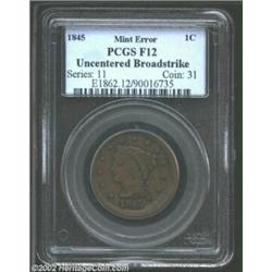 1845 1C Cent--Uncentered Broadstrike--Fine 12 PCGS. A wide lip of extra flan is seen on the lower ri