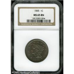 <B>1845 1C MS65 Brown NGC.</B></I> N-6, R.2. Die State B. A fully struck Gem with lovely blended golden-brown and steel-blue color. A well preserved representative of this interesting variety, best identified by the heavy mint-made die lines through the ER in AMERICA. Lot:5147