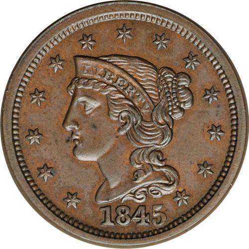 <B>1845<1C> N-1, R.4--Improperly Cleaned--NCS. Unc Details. XF40 EAC.</B></I> Grellman state a. An early die state with lines at the dentils near star 1. Finer than Brown: 189, a VF25+ example of this same die state. Rather sharply detailed with light olive brown color and moderate portions of pale orange from cleaning. A few small corrosion spots are visible, especially on the obverse.<BR><I>Ex: Garry Fitzgerald (11/13/1968).</B></I> Envelope Included.