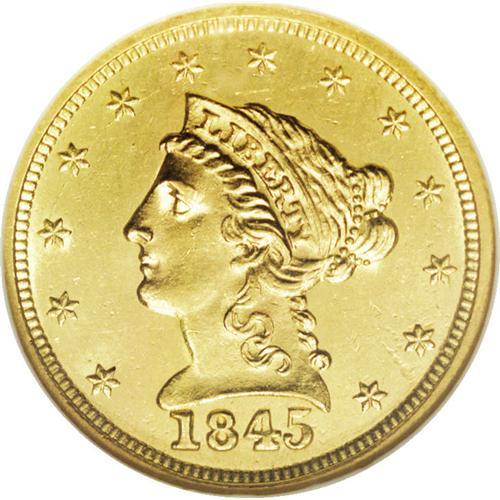 <B>1845 $2 1/2 MS63 NGC.</B></I> The 1845 is available by the standards of quarter eagles from the 1840s, but most survivors show wear, and problem-free Mint State pieces are elusive. This straw-gold example has a gorgeously smooth reverse, and the obverse is also impressively unmarked. Well struck aside from the eagle's left (facing) leg.<BR><BR><b>Shipping:</b> Coin/Currency (<a target="_blank" href="http://www.heritageauctions.com/common/shipping.php">view shipping information</a>)