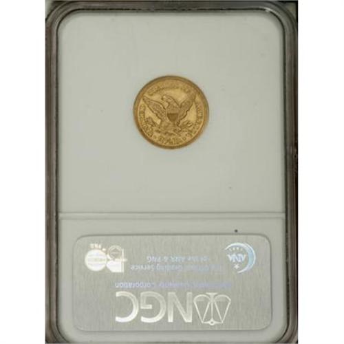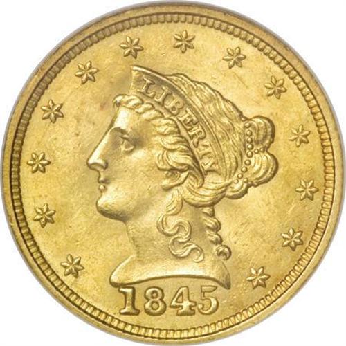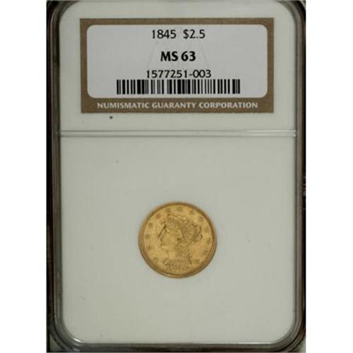 <B>1845 $2 1/2 MS63 NGC.</B></I> This issue, despite a considerable mintage of 91,051 coins, is scarce in Mint State, while available in lower grades. The present piece offers wonderful, mellow orange-gold surfaces that show only a few light, grade-consistent abrasions. A straight die crack runs from the olive stem tip to the rim at 5 o'clock. Census: 16 in 63, 7 finer (12/07).<BR><BR><B>Coin Engraver:</B> Christian Gobrecht<BR><BR><b>Shipping:</b> Coins & Currency (<a target="_blank" href="http://www.heritageauctions.com/common/shipping.php">view shipping information</a>)