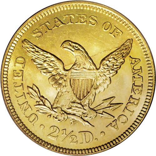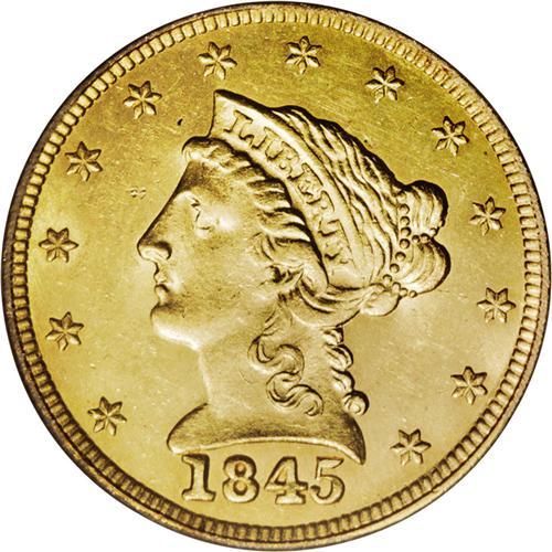 <B>1845 $2 1/2 MS63 PCGS.</B></I> Considered by some to be a "common" date from the 1840s, the 1845 is certainly not common in the better grades of Uncirculated. Only six other pieces have been so graded by PCGS, and NGC has seen 15 coins (4/07). At both services, a total of 11 pieces have been certified in finer condition. The 1845 is also interesting as the digits in the date are larger than normal as a dime punch was used. This is an especially attractive coin, especially for the grade. The fields show light striations and are consequently semi-reflective. The light yellow-gold color is accented by a slight lilac tint on the reverse. A bit softly struck in the centers, as expected.<BR><BR><b>Shipping:</b> Coins & Currency (<a target="_blank" href="http://www.heritageauctions.com/common/shipping.php">view shipping information</a>)