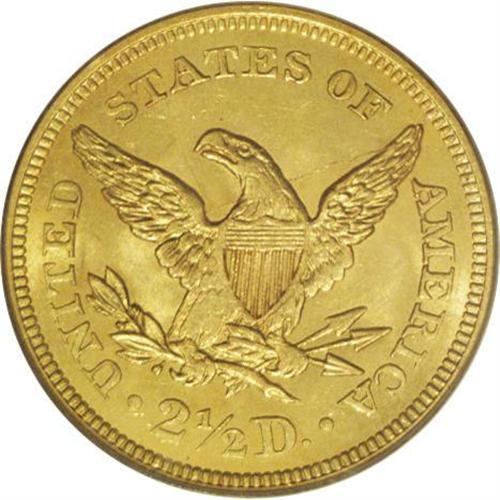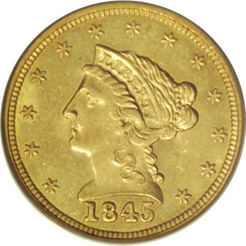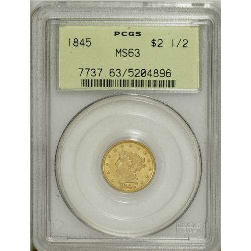 <B>1845 $2 1/2 MS63 PCGS.</B></I> Fully brilliant and lustrous yellow-gold surfaces with a hint of green color. This is a pleasing example with fully detailed obverse designs and slight weakness on the reverse, most notably on the eagles right leg. A relatively mark-free example despite the designated grade. Several die cracks dissect the reverse: from just left of the eagles neck eastward to the tip of his left wing; a pair of parallel lines from the arrow feathers south to the top of the D; and a third from the upper curve of the D down to through the denticles at 5 o'clock.<BR><BR><b>Shipping:</b> Coin/Currency (<a target="_blank" href="http://www.heritageauctions.com/common/shipping.php">view shipping information</a>)