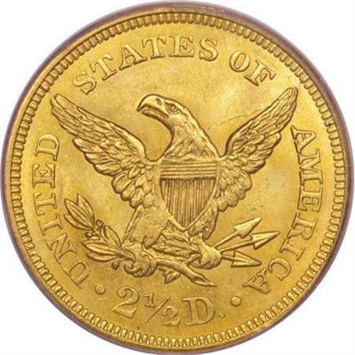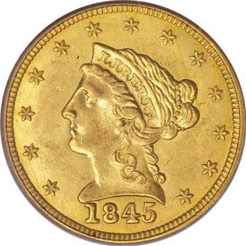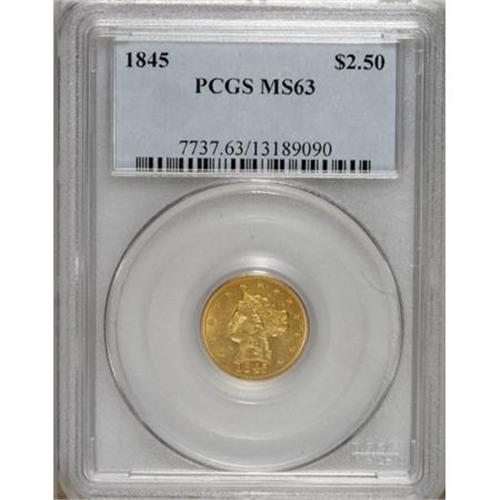 <B>1845 $2 1/2 MS63 PCGS.</B></I> The 1845 quarter eagle can be readily located up through About Uncirculated grades, and even low-end Uncirculated pieces can be had with a little searching and patience. Higher-grade coins are more challenging. The Select example we present here displays yellow-gold lustrous surfaces laced with traces of mint-green, and well impressed design elements, except for weakness in the eagle's leg feathers. A diagonal crack traverses a portion of the reverse. Die striae are visible in the fields, and some faint marks are scattered about. Population: 6 in 63, 4 finer (6/07).<BR><BR><B>Coin Engraver:</B> Christian Gobrecht<BR><BR><b>Shipping:</b> Coins & Currency (<a target="_blank" href="http://www.heritageauctions.com/common/shipping.php">view shipping information</a>\)