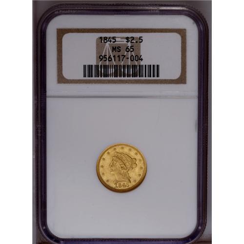 <B>1845 $2 1/2 MS65 NGC.</B></I> Even though this is one of the more available issues of the 1840's, Mint State examples are very scarce, and are virtually unobtainable in full Gem. Indeed, the present MS65 is the only, and the finest, certified by NGC. It has scintillating luster emitted from yellow-gold surfaces, and the design elements are sharply impressed throughout. The surfaces are lovingly preserved on both sides.
