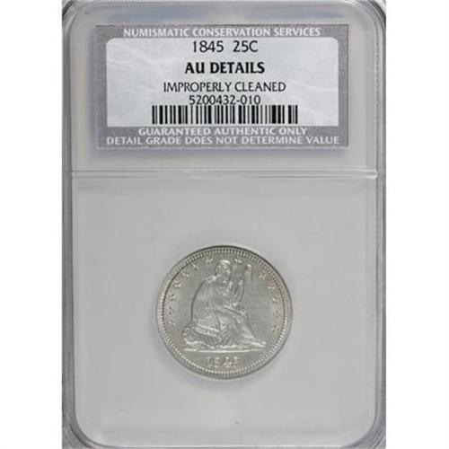 <B>1845 25C --Improperly Cleaned--NCS. AU Details.</B></I> NGC Census: (0/0). PCGS Population (0/0). Mintage: 922,000. (#5408)<BR><BR><B>Coin Engraver:</B> Christian Gobrecht<BR><BR><b>Shipping:</b> Coins & Currency (<a target="_blank" href="http://www.heritageauctions.com/common/shipping.php">view shipping information</a>)