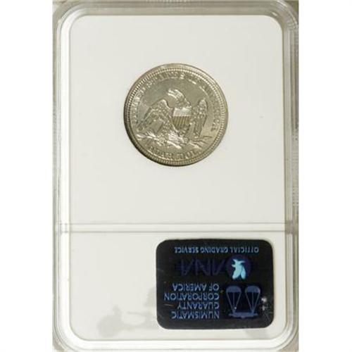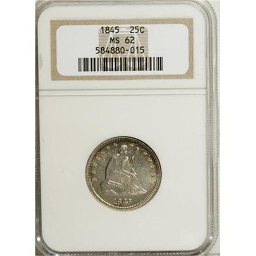 <B>1845 25C MS62 NGC.</B></I> Breen-3961. Repunched 5 over Smaller 5. This piece has a die crack extending through the base of the date to the left border. Additional die cracks can be seen around much of the obverse. Most of the obverse and reverse surfaces on this satiny Mint State piece are brilliant, with traces of pale gold and lilac toning along the obverse border.<BR><BR><b>Shipping:</b> Coins & Currency (<a target="_blank" href="http://www.heritageauctions.com/common/shipping.php">view shipping information</a>)