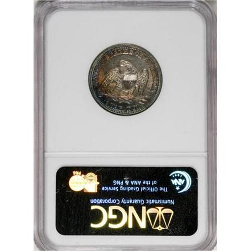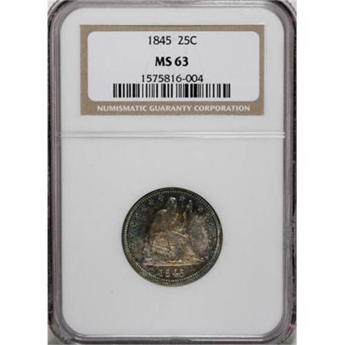 <B>1845 25C MS63 NGC.</B></I> Though available in lower grades, the 1845 offers a significant challenge in Select and better. Sunset-orange and cornflower-blue patina covers much of this pleasingly detailed piece, which shows a number of thin abrasions in the fields. Census: 16 in 63, 20 finer (8/07).<BR><BR><B>Coin Engraver:</B> Christian Gobrecht<BR><BR><b>Shipping:</b> Coins & Currency (<a target="_blank" href="http://www.heritageauctions.com/common/shipping.php">view shipping information</a>)