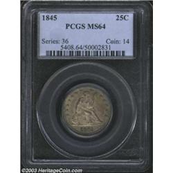<TABLE cellSpacing=0 cellPadding=0 width="100%" bgColor=#000000 border=0><TBODY><TR><TD width="100%"><TABLE cellSpacing=1 cellPadding=3 width="100%" border=0><TBODY><TR><TD width="100%" bgColor=#79735c><FONT face=arial color=#ffffff size=3><B>Description</B> </FONT></TD></TR><TR><TD width="100%" bgColor=#ffffff><FONT face=arial size=2><B>1845 25C MS64 PCGS.</B></I> Large 5 Over Small 5. Well detailed beneath steel-gray and pastel toning. A difficult early No Motto issue in better Mint State grades and most likely Condition Census with the dramatically repunched 5. </FONT></TD></TR></TBODY></TABLE></TD></TR></TBODY></TABLE><BR><A name=PricesRealized></A><TABLE cellSpacing=0 cellPadding=0 width="100%" bgColor=#000000 border=0><TBODY><TR><TD width="100%"><TABLE cellSpacing=1 cellPadding=3 width="100%" border=0><TBODY><TR><TD width="100%" bgColor=#79735c><A name=PR><FONT face=arial color=#ffffff size=3><B>Previous Prices from Heritage Auctions</B> </FONT></A></TD></TR><TR><TD bgColor=#f6f6ed><TABLE cellSpacing=0 cellPadding=0 width="100%" border=1><TBODY><TR><TD align=middle width="33%"><B>Date</B></TD><TD align=middle width="33%"><B>Service</B></TD><TD align=middle width="33%"><B>Price</B></TD></TR><TR bgColor=whitesmoke><TD width="33%"><B>02/23/2001</B></TD><TD width="33%">PCGS</TD><TD width="33%">$2,300.00</TD></TR><TR bgColor=whitesmoke><TD width="33%"><B>01/11/2003</B></TD><TD width="33%">NGC</TD><TD width="33%">$1,380.00</TD></TR><TR bgColor=whitesmoke><TD width="33%"><B>11/07/1998</B></TD><TD width="33%">NGC</TD><TD width="33%">$1,375.00</TD></TR><TR bgColor=whitesmoke><TD width="33%"><B>06/01/1997</B></TD><TD width="33%">NGC</TD><TD width="33%">$1,375.00</TD></TR></TBODY></TABLE></TD></TR><TR><TD bgColor=#ffffff><FONT face=arial size=1 ?>PLEASE NOTE: All prices realized reflect the final hammer price PLUS the buyer's premium in auctions that charge a buyer's premium. Each item has a notation at the top of the listing indicating whether that lot included a buyer's premium. Example: A item that sells with a final hammer price of $100 and a 20% buyer's premium will display with a price realized of $120. All information listed is intended to be as accurate as possible, but errors are possible. Please use this guide carefully and inform us of any inaccuracies. </FONT></TD></TR></TBODY></TABLE></TD></TR></TBODY></TABLE><BR><TABLE cellSpacing=0 cellPadding=0 width="100%" bgColor=#000000 border=0><TBODY><TR><TD width="100%"><TABLE cellSpacing=1 cellPadding=3 width="100%" border=0><TBODY><TR><TD width="100%" bgColor=#79735c colSpan=6><FONT face=arial color=#ffffff size=3><B>Price Guide*</B> </FONT></TD></TR><TR bgColor=#f6f6ed><TD align=middle><B>Grade</B> </TD><TD align=middle><B>Coin World<BR>(Trends)</B> </TD><TD align=middle><B>Numismedia<BR>Retail</B> </TD><TD align=middle><B>Numismedia<BR>Wholesale</B> </TD><TD align=middle><B>Coin<BR>Universe</B> </TD><TD align=middle><B>Heritage<BR>Value Index</B> </TD></TR><TR bgColor=#ffffff><TD align=middle>63</TD><TD align=right>$1,200.00</TD><TD align=right>$810.00</TD><TD align=right>$675.00</TD><TD align=right>$845.00</TD><TD align=right>$687.17</TD></TR><TR style="FONT-WEIGHT: bold" bgColor=#cccfdd><TD align=middle>64</TD><TD align=right>$2,750.00</TD><TD align=right>---</TD><TD align=right>$1,975.00</TD><TD align=right>$3,125.00</TD><TD align=right>$1,845.63</TD></TR><TR bgColor=#ffffff><TD align=middle>65</TD><TD align=right>---</TD><TD align=right>---</TD><TD align=right>$4,140.00</TD><TD align=right>$7,425.00</TD><TD align=right>$4,353.75</TD></TR><TR bgColor=#ffffff><TD colSpan=6><FONT size=1>*All information listed is intended to be as accurate as possible, but errors are possible. No item may be returned or refused based on this information which is provided as a service to our customers. You should contact each pricing source directly to determine the accuracy of this information. </FONT></TD></TR></TBODY></TABLE></TD></TR></TBODY></TABLE><BR><TABLE cellSpacing=0 cellPadding=0 width="100%" bgColor=#000000 border=0><TBODY><TR><TD width="100%"><TABLE cellSpacing=1 cellPadding=3 width="100%" border=0><TBODY><TR><TD width="100%" bgColor=#79735c><FONT face=arial color=#ffffff size=3><B>Population Guide</B> </FONT></TD></TR><TR bgColor=#ffffff><TD align=middle><!-- Begin Output of Population Grid--><TABLE cellSpacing=0 cellPadding=0 width="100%" border=0><TBODY><TR><TD vAlign=center><TABLE cellSpacing=0 width="100%" border=1 cellsadding="3"><TBODY><TR><TD vAlign=center><TABLE cellSpacing=0 cellPadding=3 width="100%" border=1><TBODY><TR><TD vAlign=center align=middle bgColor=#f0f1e8 colSpan=2 <CENTER><FONT face=Arial size=2><B>PCGS Pop </B></FONT><CENTER></CENTER></TD><TD vAlign=center align=middle bgColor=#f0f1e8 colSpan=2><CENTER><FONT face=Arial size=2><B>NGC Pop</B></CENTER></FONT></TD></TR><TR><TD vAlign=center><FONT face=Arial size=2>(64)</FONT> </TD><TD vAlign=center align=right><FONT face=Arial size=2>5</FONT> </TD><TD vAlign=center><FONT face=Arial size=2>(64)</FONT> </TD><TD vAlign=center align=right><FONT face=Arial size=2>15</FONT> </TD></TR><TR><TD vAlign=center><FONT face=Arial size=2>(>64)</FONT> </TD><TD vAlign=center align=right><FONT face=Arial size=2>3</FONT> </TD><TD vAlign=center><FONT face=Arial size=2>(>64)</FONT> </TD><TD vAlign=center align=right><FONT face=Arial size=2>4</FONT> </TD></TR></TBODY></TABLE></TD></TR></TBODY></TABLE></TD></TR></TBODY></TABLE><!-- End Output of Population Grid--> Important notice: Heritage usually auctions material at the rate of 200-250 lots per hour. On some occasions eBay Live bid software or the Internet may not be able to keep up with the pace of the auction. We recommend placing a realistic absentee bid now as insurance to avoid disappointment. Occasionally the auctioneer may eliminate or reject an eBay Live bid, and the auctioneer may also reopen a lot after the close of the eBay live bidding (usually because we missed an audience bid), and may reject your bid even if it shows you 