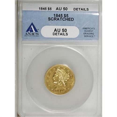 <B>1845 $5 --Scratched--ANACS.</B></I> <B>AU50 Details.</B></I> NGC Census: (19/202). PCGS Population (27/75). Mintage: 417,099. Numismedia Wsl. Price for NGC/PCGS coin in AU50: $352. (#8223)<BR><BR><B>Coin Engraver:</B> Christian Gobrecht<BR><BR><b>Shipping:</b> Coins & Currency (<a target="_blank" href="http://www.heritageauctions.com/common/shipping.php">view shipping information</a>)