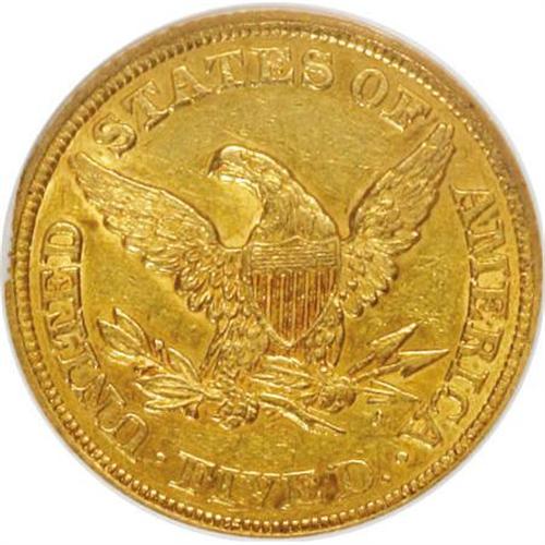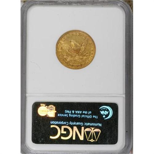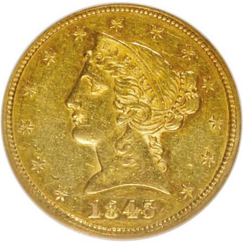 <B>1845 $5 AU55 NGC.</B></I> NGC Census: (51/107). PCGS Population (20/40). Mintage: 417,099. Numismedia Wsl. Price for NGC/PCGS coin in AU55: $420. (#8223)<BR><BR><B>Coin Engraver:</B> Christian Gobrecht<BR><BR><b>Shipping:</b> Coins & Currency (<a target="_blank" href="http://www.heritageauctions.com/common/shipping.php">view shipping information</a>\)