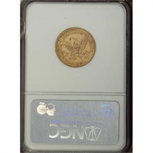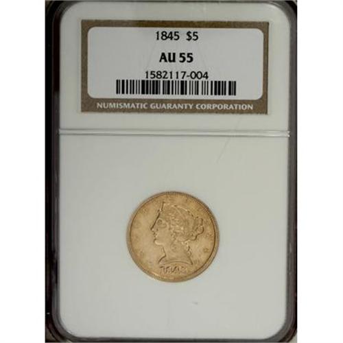 <B>1845 $5 AU55 NGC.</B></I> . NGC Census: (54/117). PCGS Population (20/45). Mintage: 417,099. Numismedia Wsl. Price for NGC/PCGS coin in AU55: $420. (#8223)<BR><BR><B>Coin Engraver:</B> Christian Gobrecht<BR><BR><b>Shipping:</b> Coins & Currency (<a target="_blank" href="http://www.heritageauctions.com/common/shipping.php">view shipping information</a>)