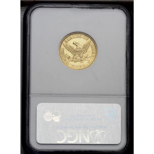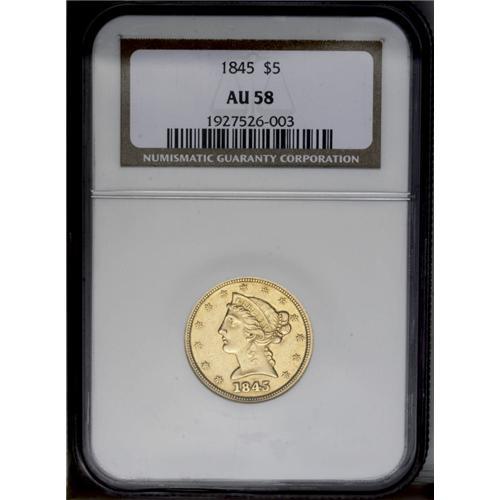 <B>1845<$5> AU58 NGC.</B></I> Light highpoint friction scarcely impedes the luster of the wheat-gold surfaces. An attractive coin with only a few scattered marks, most notably in the left obverse field.