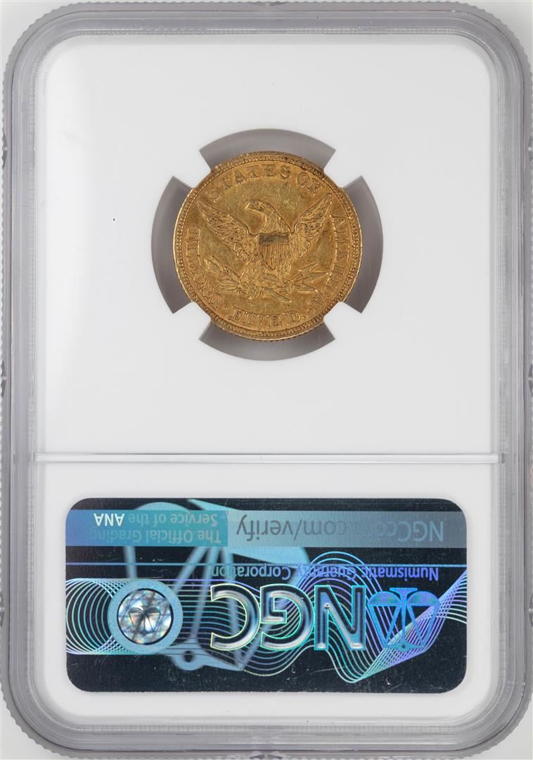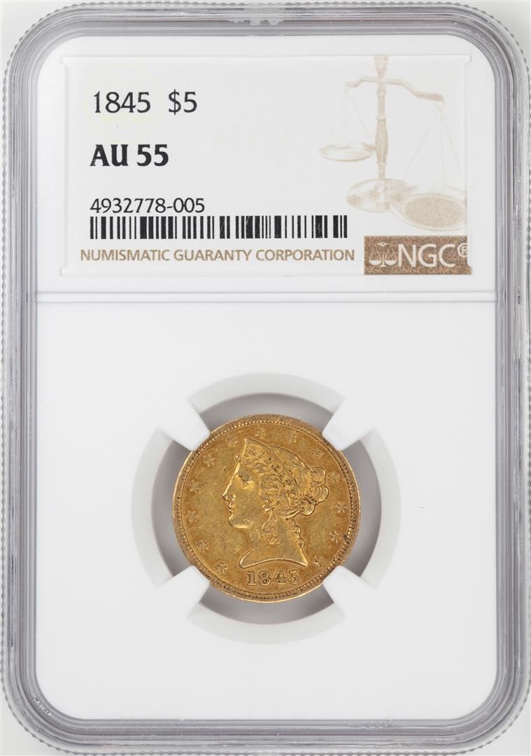One 1845 $5 Liberty Head Half Eagle Gold Coin NGC AU55. NGC Certified.