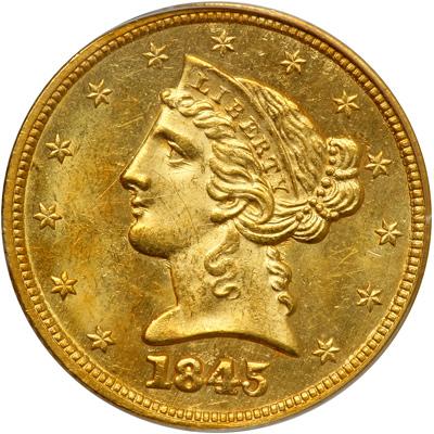1845 $5 Liberty. PCGS graded MS-64. Well struck and shimmering with lustrous semi-reflective surfaces. A very choice example that sits high in the condition census. (Note, smudging on the PCGS holder precludes a clearer photographic image of the reverse on this coin.) Highly lustrous examples like this are extreme rarities and with satiny medium gold surfaces this one displays warm shimmering iridescence. Sharply struck. Surprisingly rare in Mint State despite a seemingly munificent mintage for the date of 417,099 pieces. Beyond doubt, a pleasing example of the date, high Condition Census, a coin of importance to numismatics, exceeded in quality by none other of which we are aware.