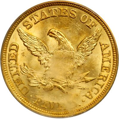 The reverse by Gobrecht shows an eagle with a shield on its breast, perched on an olive branch and holding three arrows. The inscription UNITED STATES OF AMERICA, FIVE D. surrounds. The denomination would not be spelled out in its entirety on $5 gold pieces until 1908 when the Indian head was introduced. Pop 10; none finer at PCGS (PCGS # 8223).