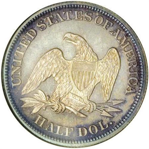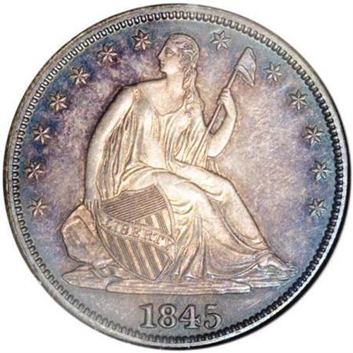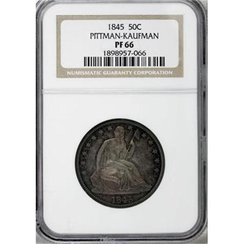 <B>1845 50C PR66 NGC.</B></I> Ex: Pittman-Kaufman. Of all the remarkable early silver proof coins in the Kaufman Collection, these 1845 proofs are the finest, overall. Each of the five pieces stands alone as the finest that has been certified! The half dollar is two points finer than the next best example that NGC has graded.<BR><BR>Discussing the 1845 half dollar in their<I> Liberty Seated Half Dollars</B></I> guide, Randy Wiley and Bill Bugert say that less than six of the proofs "are known; and Walter Breen, in his <I>Proof</B></I> <I>Encyclopedia,</B></I> cites three separate 1845 proof half dollar appearances. He then goes on to say: "Two others seen, so badly cleaned as to render their original proof status dubious."<BR><BR> Only four 1845 proof half dollars have been certified by NGC and PCGS. The former service graded a PR66, which is the Pittman-Kaufman coin, and two PR64's. The PCGS example is a PR63.<BR><BR> As part of his May 1998 cataloging of the John Jay Pittman 1845 proof half dollar, David Akers writes:<BR><BR>"The 1845 Half Dollar in Proof is one of the great Liberty Seated Proof rarities of the 1840's. It is the rarest silver denomination of this year and it is also one of the two rarest Proof Half dollars of the decade along with the 1840. All 1845 silver denominations, except the Silver Dollar, were struck in Proof only for inclusion in the 10-15 Proof sets issued that year. I have been able to confirm the existence of only four distinct examples of the Half Dollar but, of course, it is always possible that one or more additional specimens exist."<BR><BR> Our research of auction records has added at least one more known 1845 proof half dollar, illustrated in the following roster:<BR><BR><B>1. PR66 NGC. The Kaufman coin. </B></I>James Kelly (1946); John Jay Pittman (David Akers, 5/1998), lot 1711, as part of a complete 1845 proof set, the Seated Liberty coins kept intact by Phil Kaufman.<BR><BR><B>2. PR64 NGC.</B></I> F.C.C. Boyd; World's Greatest Collection (Numismatic Gallery, 4/1945), lot 273; Stack's (3/1965), lot 447; Superior (5/1989), lot 5371; Superior (10/1990), lot 3662.<BR><BR><B>3. PR63 PCGS.</B></I> Louis E. Eliasberg, Sr.; Eliasberg Estate (Bowers and Merena, 4/1997), lot 1929; Phil Kaufman; Bowers and Merena (1/1999), lot 1142; Richmond Collection (David Lawrence, 3/2005), lot 1789; American Numismatic Rarities (6/2006), lot 1487.<BR><BR><B>4. Proof.</B></I> New England (7/1978)<BR><BR><B>5. Proof.</B></I> Smithsonian Institution. <BR><BR><B><I>Additional Appearances</B></I></B></I><BR><BR><B>A. Proof. </B></I>RARCOA (1/1973), lot 872.<BR><BR> Beautiful toning adorns each side of this Premium Gem. Light to medium cobalt-blue concentrates at the peripheries, then yields to violet, and finally to champagne-gold in the centers. A solid strike results in every individual die element being intricately and impeccably detailed. Additionally, the design elements possess a light frosty finish, resulting in mild contrast with the mirrored fields. Well cared for surfaces are devoid of contact marks, and reveal just a few faint, inoffensive hairlines in the fields. This outstanding coin exudes exceptional technical quality and aesthetic appeal.<BR><I>From The Phil Kaufman Collection of Early Seated Proof Sets, Part Two.</B></I><BR><BR><B>Coin Engraver:</B> Christian Gobrecht<BR><BR><b>Shipping:</b> Coins & Currency (<a target="_blank" href="http://www.heritageauctions.com/common/shipping.php">view shipping information</a>)